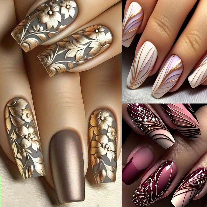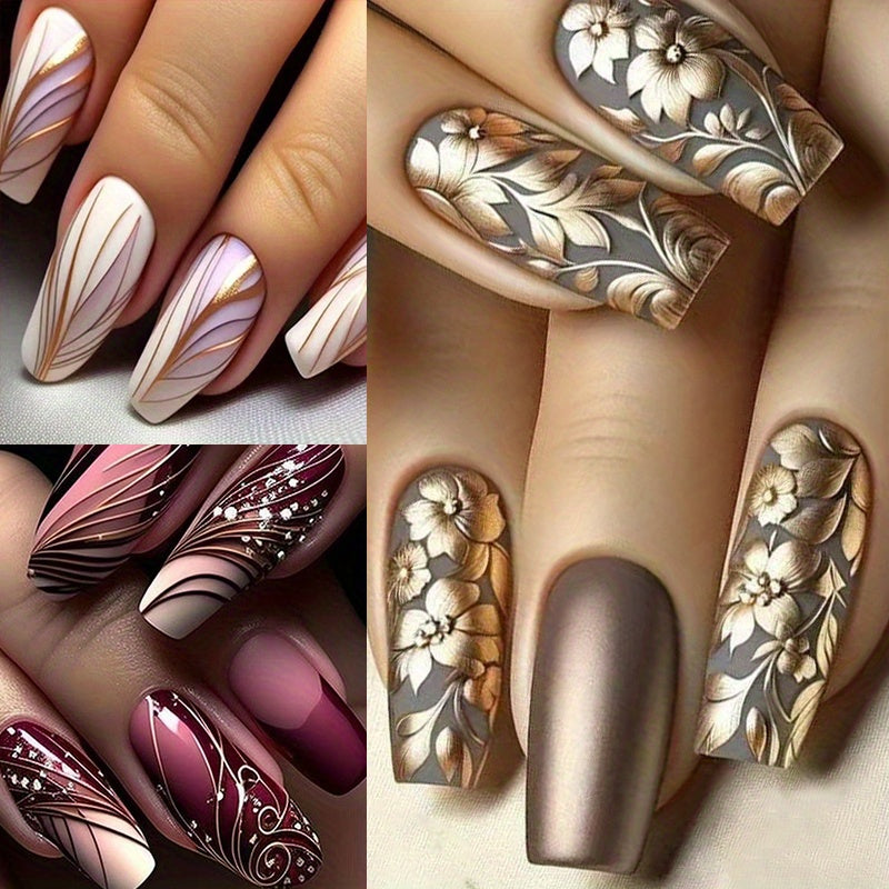 • Stunning Color Palette: Featuring long, glossy coffee brown tones with exquisite golden flower accents, these press-on nails will make a statement wherever you go.